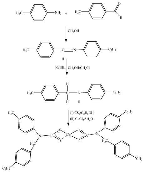 4-ethylaniline (4.0 mmol) and p-tolualdehyde (4.0 mmol) were dissolved in methanol, after which their solutions were mixed together and then stirred steadily at room temperature. After 2 h, the solution was evaporated to remove the solvent. The resulting oily product was dissolved in a 20 mL solution of methanol and dichloromethane (1:1). To this solution, was added sodium borohydride (2.8 mmol) and stirring was maintained for 2 h in ice, followed by 20 h stirring at room temperature. Thereafter, the solvent was evaporated, rinsed with water, and extracted with dichloromethane. The solvent was removed to give oily substituted amine and the product was rinsed with water and extracted using dichloromethane. The evaporation of the organic layer gave the substituted amine as a brownish oil. The substituted amine was dissolved in ethanol and then potassium hydroxide (4.0 mmol) was added to the solution and stirred for 30 min, followed by dropwise addition of carbon disulfide (4.0 mmol), while the temperature was maintained for 2 h. Copper(II) chloride dihydrate (2.0 mmol) was added to the solution with constant stirring. The resulting precipitate, copper(II) bis(N-4-methylbenzyl)-N-(4-ethylphenyl) dithiocarbamate, was washed with cold water and then air dried (Scheme 1) [77].