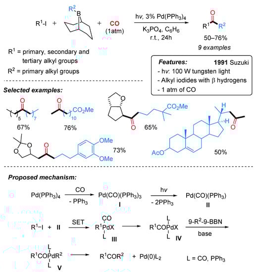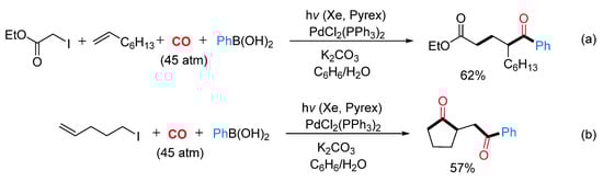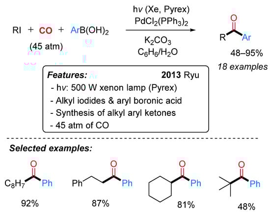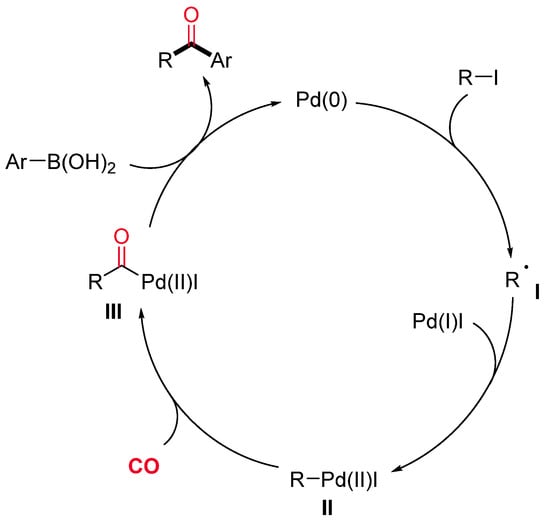 Inspired by the work of Suzuki and Miyaura [,], the same research group reported a PdCl2(PPh3)2-catalyzed light-promoted synthesis of alkyl aryl ketones via carbonylative cross-coupling reaction of alkyl iodides, CO and arylboronic acids []. Basic conditions (K2CO3), 45 atm of CO and the presence of water were essential for the success of the reaction (Scheme 10). Primary, secondary and tertiary alkyl iodides were successfully coupled with CO and a series of substituted arylboronic acids, bearing both electron-withdrawing and electron-donating groups. The mechanism can likely pass through the formation of an acylpalladium complex via carbonylation of the alkyl radical I, which is generated by the action of Pd(0) and light from the alkyl iodide (Scheme 11). The transmetalation of an arylboronic acid with the acylpalladium intermediate III leads to the corresponding acyl(aryl)palladium species, which undergoes reductive elimination to the desired alkyl aryl ketone and Pd(0) (Scheme 11).