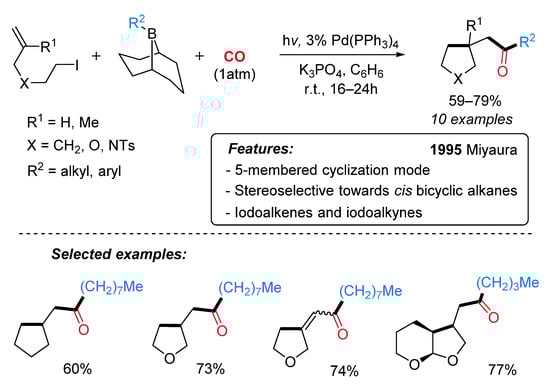 Based on their previous studies [], Miyaura and co-workers developed a palladium-catalyzed three-component reaction between iodoalkenes, carbon monoxide and 9-alkyl- or 9-aryl-9-BBN derivatives to obtain cyclized unsymmetrical ketones under photoirradiation conditions (Scheme 2) []. Analogously to the previously reported mechanism (Scheme 1), the iodoalkenes provided cyclized ketones via radical cyclization, carbon monoxide insertion and coupling with 9-R2-9-BBN derivatives. Iodoalkynes led to the corresponding cyclized unsaturated ketones as a 1:1 mixture of E and Z isomers. Interestingly, iodocycloalkenes resulted in the formation of cis-fused bicyclic alkanes starting from trans iodides as well (Scheme 2). This, together with the predominance of 5-membered over the 6-membered annulation mode, can further confirm the radical nature of the reaction pathway.