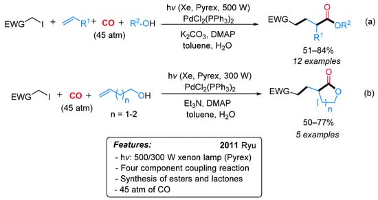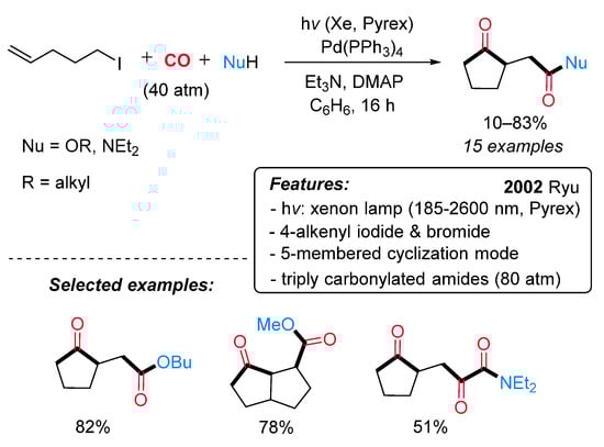 Palladium-catalyzed photochemical carbonylation reactions aimed at the synthesis of ketones, α,β-unsaturated ketones, esters, lactones and carbamoylacetates have been extensively studied by lhyong Ryu and co-workers [,,]. The initial idea was to insert carbon monoxide on an alkyliodide by homolytic cleavage of the C–I bond. The idea has been successfully realized under irradiation and metal-free conditions (vide infra, Section 1.6) [].