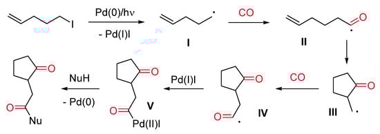 - Ryu, I.; Kreimerman, S.; Araki, F.; Nishitani, S.; Oderaotoshi, Y.; Minakata, S.; Komatsu, M. Cascade Radical Reactions Catalyzed by a Pd/Light System: Cyclizative Multiple Carbonylation of 4-Alkenyl Iodides. J. Am. Chem. Soc. 2002, 124, 3812–3813. [Google Scholar] [CrossRef] [PubMed]