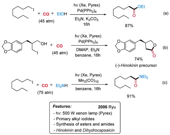 Based on their previous report [], Ryu and co-workers reported a general method for the synthesis of esters and amides [] and, in particular, described the acceleration effect of light-induced atom transfer carbonylation reactions obtained in the presence of Pd(0) complexes and Mn2(CO)10. Therefore, for example, when 1-iodooctane was caused to react with CO and ethanol under photoirradiation conditions (Xenon lamp, 185–2600 nm), ethyl nonanoate was obtained in a moderate yield of 54% even with prolonged reaction time (50 h). However, the same reaction in the presence of Pd(PPh3)4 (5 mol %) afforded the expected ethyl ester in 87% yield after 16 h (Scheme 5a). Under similar conditions, the synthesis of a precursor of the (-)-Hinokinin was efficiently achieved (Scheme 5b).