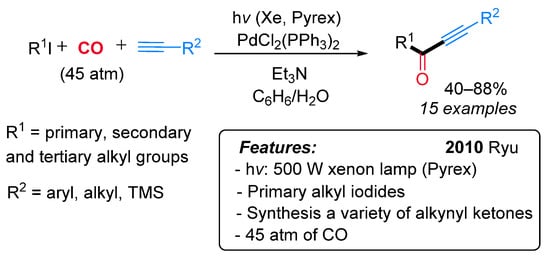 - Fusano, A.; Fukuyama, T.; Nishitani, S.; Inouye, T.; Ryu, I. Synthesis of Alkyl Alkynyl Ketones by Pd/Light-Induced Three-Component Coupling Reactions of Iodoalkanes, CO, and 1-Alkynes. Org. Lett. 2010, 12, 2410–2413. [Google Scholar] [CrossRef]