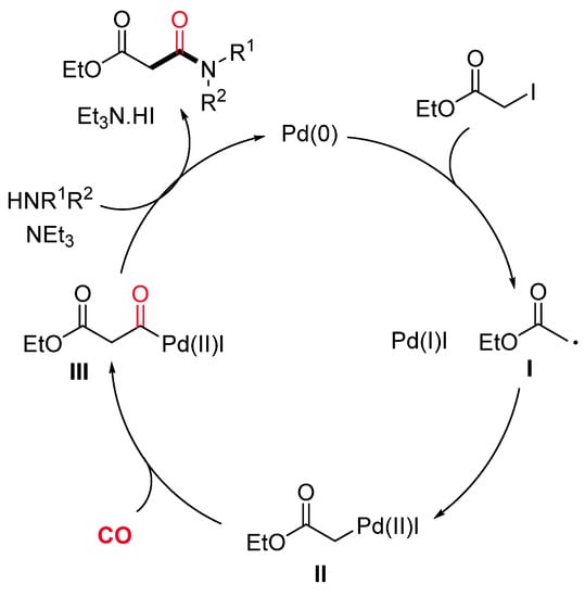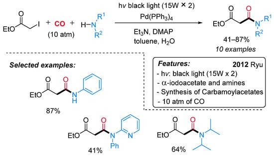 - Sumino, S.; Fusano, A.; Fukuyama, T.; Ryu, I. Synthesis of Carbamoylacetates from α-Iodoacetate, CO, and Amines under Pd/Light Combined Conditions. Synlett 2012, 23, 1331–1334. [Google Scholar] [CrossRef]