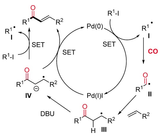 In this approach, alkyl radicals (I) were formed from alkyl iodides via single-electron transfer (SET) and underwent a sequential addition to CO and alkenes to give β-keto radicals (III). It is proposed that DBU would abstract a proton in α to the carbonyl to form radical anions (IV), giving α,β-unsaturated ketones via SET (Scheme 14).