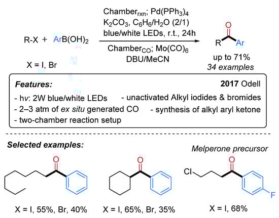 Recently, Odell and co-workers have developed a Pd(PPh3)4-catalyzed carbonylative Suzuki–Miyaura coupling of unactivated alkyl halides with aryl boronic acids by means of visible-light irradiation with low CO pressure (2–3 atm) at room temperature for the synthesis of aryl alkyl ketones []. This methodology features the use of solid CO-source instead of gaseous CO, readily available LED lights and a double-chamber system, one for the CO generation and the other for the palladium-catalyzed reaction (Scheme 15). Under the optimized conditions, various alkyl iodides and bromides reacted with CO and differently substituted aryl boronic acids to provide the desired ketones with moderate to good yields. The same protocol was successfully applied for the synthesis of a precursor of melperone, an antipsychotic drug.