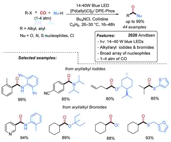 A recent report by Arndtsen’s group has brought a breakthrough in the area of palladium-catalyzed carbonylation reactions. A new palladium-catalyzed/light-induced methodology for the synthesis of a broad array of carbonylated compounds (acid chlorides, esters, amides and ketones) starting from aryl/alkyl iodides and bromides has been reported (Scheme 16) []. Compared to previous protocols, this method features high versatility, high functional group tolerance, an impressive reaction scope and mild reaction conditions. In particular, this protocol is compatible with aldehydes, protected amines, esters, nitriles, thioethers and heterocyclic substrates on aryl iodides and bromides. The synthesis of β-amino acid derivatives was achieved with high efficiency. In addition, electron-rich arenes and heteroarenes were successfully employed in place of nitrogen or oxygen nucleophiles. The importance of palladium catalyst and visible light in this radical reaction has been consistently demonstrated, and, in particular, mechanistic studies revealed that light acts as two different roles in this transformation, enabling, together with the palladium catalytic system, both the oxidative addition and reductive elimination steps.