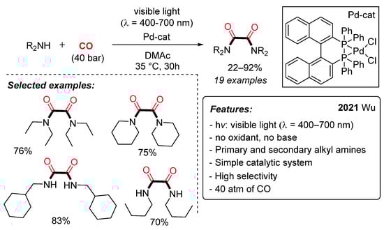 Oxalamides represent a class of relevant compounds frequently found in bioactive and pharmaceutical molecules [] and used as a ligand in asymmetric catalysis []. Wu and co-workers have recently developed a novel, highly sustainable visible-light-induced palladium-catalyzed method for the synthesis of oxalamides from amines and carbon monoxide []. The versatile and green methodology relies on the use of visible light in combination with palladium/BINAP catalysts (Scheme 17) without any oxidant or base. In addition, the protocol features high selectivity (no urea byproducts were detected) and the possibility to reuse the Pd complex without loss of efficiency. Notably, in some cases, the presence of methylene blue as photosensitizer led to a significant improvement in the yield.