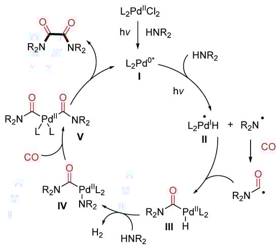 Based on control and EPR experiments, the authors propose that the active L2Pd(0)* species I is first generated in situ from L2Pd(II)Cl2 in the presence of the amine under visible-light irradiation (Scheme 18). Then, after a SET process with the amine, a nitrogen-radical and a Pd(I)-radical species II are generated. The reaction of CO with the nitrogen radical leads to an acyl radical, which recombines with II delivering intermediate III. The latter undergoes a ligand exchange to provide complex IV and molecular hydrogen, which was detected by gas GC. The insertion of another CO molecule provides a bis(carbamoyl)palladium intermediate V, which undergoes a reductive elimination step to give the expected oxamide and a Pd(0) species.