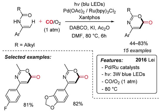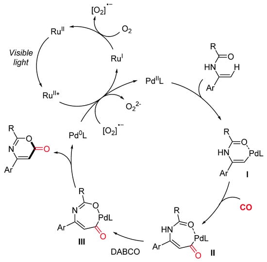 In 2016, Lei et al. disclosed a new intramolecular oxidative carbonylation of enamides as a mild and environmentally friendly protocol for the synthesis of 1,3-oxazin-6-ones. Oxygen was employed as a terminal oxidant, avoiding the need for stoichiometric amounts of metal salts, such as Cu(II) salts []. The success of the strategy relies on the combination of palladium and photoredox catalysis and, in particular, Pd(OAc)2 and Ru(bpy)3Cl2 were both used in catalytic amounts together with Xantphos as phosphine ligand (Scheme 19). The generality of the reaction was demonstrated as both electron-withdrawing and electron-donating groups, including heteroaromatic rings (furan and thiophene), were well tolerated under the optimized conditions. The authors suggest that the photocatalyst is exclusively involved in the reoxidation of palladium, as described in Scheme 20. Firstly, taking advantage of the amide group, a Pd catalyzed alkenyl C–H activation affords a vinylpalladium complex I. Then, a molecule of CO coordinates and inserts, leading to the acylpalladium intermediate II. Subsequently, DABCO enables the formation of complex III, and, finally, a reductive elimination step delivers the oxazinone product and Pd(0) species. Re-oxidation of palladium(0) can be exerted by the excited Ru(II)* leading to Pd(II)L, which restart a new catalytic cycle, and Ru(I), which, in its turn, can be oxidized back to Ru(II) by molecular oxygen. The generated superoxide anion may also oxidize the Pd(0) species by electron transfer. The presence of KI was found to improve the efficiency of this transformation, likely through coordination of palladium(II) species, while Ac2O was suggested to reduce the possible formation of inactive palladium(0) species under the CO atmosphere.
