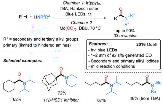 Amides are ubiquitous in both natural and synthetic compounds, including pharmaceutical products. Odell and co-workers have recently developed a visible light-mediated fac-Ir(ppy)3 catalyzed amino carbonylation of unactivated alkyl iodides under mild reaction conditions []. The desired amides are produced in moderate to excellent yields through a two-chamber system (H-tube), where the CO is released ex situ from Mo(CO)6) (Scheme 21). Secondary and tertiary iodides can be successfully aminocarbonylated with a wide range of amine nucleophiles, whereas primary iodides provide satisfactory results in combination with hindered amines only. Remarkably, a dealkylative-aminocarbonylation pathway occurs when alkyl halides react with tertiary amines. The reaction mechanism starts with the reductive dehalogenation of an alkyl halide (R–X) to give the alkyl radical I, followed by CO insertion with the formation of an acyl radical intermediate II. The latter is either quenched by the starting alkyl iodide to produce an acyl iodide III or oxidized to an acylium ion IV. The nucleophilic attack of the amine on the acyl iodide or the acylium ion affords the final amide (Scheme 22).