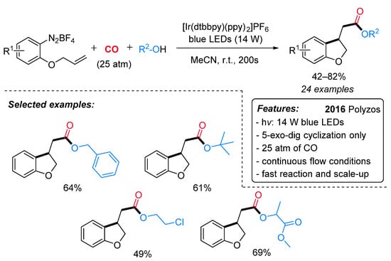 A variety of acetate-containing 2,3-dihydrobenzofurans have been synthesized by Polyzos et al. through a visible light-mediated Ir-catalyzed radical carbonylation process under continuous flow conditions []. Overcoming the traditional limitations of both Pd-catalyzed alkoxycarbonylation reactions and classical radical-free carbonylation processes in terms of regioselectivity, the pressure of CO and sustainability [], alkenyl-tethered arenediazonium salts underwent a versatile and stereoselective (exclusive 5-exo-dig cyclization) cyclization and alkoxycarbonylation cascade to a wide range of 2,3-dihydrobenzofuran derivatives in the presence of [Ir(dtbbpy)(ppy)2]PF6 as catalyst under blue LEDs (14 W) at room temperature (Scheme 23). Electron-donating and electron-withdrawing substituents on the arenediazonium salt moiety were nicely tolerated under the standard conditions. Regardless of steric bulk, alkyl alcohols were successfully employed as coupling partners to produce the desired esters in moderate to good yields. This continuous flow methodology also features a very short reaction time (200 s), moderate CO pressures (25 atm) and a straightforward scale-up. Interestingly, the commercial Ru(bpy)3Cl2·6H2O was found to be slightly less efficient in this transformation.