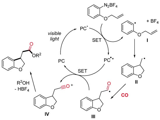 The mechanism is supposed to start with the homolytic cleavage of the C–N bond of the allyloxy-tethered arenediazonium salt by single-electron transfer from the photocatalyst in its excited state (PC*), with the generation of an aryl radical I and the oxidized photocatalyst PC•+ (Scheme 24). An intramolecular radical alkene addition provides the primary alkyl radical II, which, after CO insertion, gives the acyl radical III. Oxidation of the acyl radical by the oxidized photocatalyst PC•+ results in the formation of an acylium ion IV and the regeneration of the photocatalyst PC. Lastly, the reaction of IV with alcohol leads to the final product.