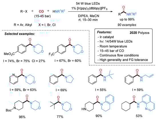 In 2020, Polyzos and co-workers reported an Ir-catalyzed visible-light-promoted aminocarbonylation of alkyl and aryl halides with CO and amines under continuous flow conditions (Scheme 25) []. The iridium-based photocatalyst ([Ir(ppy)2(dtbbpy)]PF6) was used in combination with DIPEA (N,N-diisopropylethylamine) as a sacrificial reductant and under blue LED (54 W) irradiation. A large variety of aryl halides (I, Br, Cl) and alkyl iodides (primary, secondary and tertiary) reacted successfully with CO and an array of alkyl and aryl amines to provide the expected amides in good to high yields. The continuous flow system was assembled from commercially available components, featuring operational simplicity, high applicability, improved safety and easy scalability.