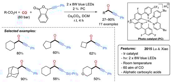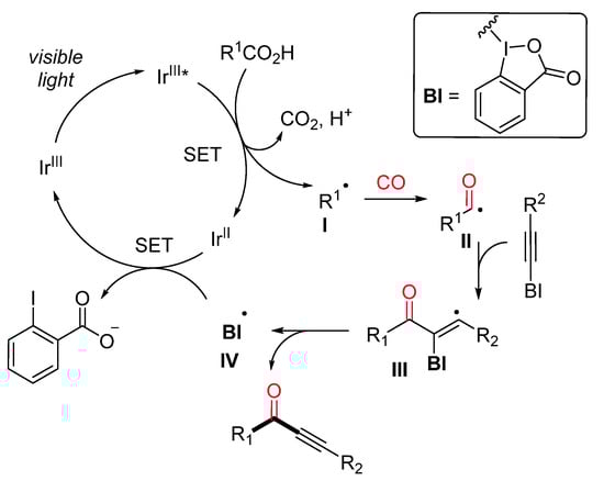 Ynones represent an important motif present in bioactive compounds and are useful intermediates in the synthesis of heterocycles []. Alternative to the previously described Ryu’s method [], Lu and Xiao et al. have recently developed an efficient protocol for the synthesis of ynones through a visible-light-induced photocatalytic decarboxylative carbonylative alkynylation of carboxylic acids in the presence of carbon monoxide (CO) at room temperature []. The decarboxylative alkynylation reaction was carried out using ethynylbenziodoxolones (EBX) as the alkynylating agent, carboxylic acid, in the presence of Ir[dF(CF3)ppy]2(dtbbpy)PF6 as a photocatalyst and Cs2CO3 as a base (Scheme 26). A range of aliphatic carboxylic acids gave the corresponding ynones in good to excellent yields under mild conditions but extremely high pressure of CO. Mechanistically, it is proposed that the excited photocatalyst Ir(III)*, generated from Ir(III) under visible-light irradiation, is able to oxidize the substrate with the formation of an alkyl radical I (Scheme 27). Then, the latter, after CO insertion, gives rise to an acyl radical II, which undergoes radical addition to the alkylating agent affording the radical intermediate III. The subsequent radical elimination reaction yields the desired ynone and the benziodoxolonyl radical IV. Finally, radical IV is reduced to ortho-iodobenzoate by Ir(II), which, in turn, is oxidized to Ir(III) for a new catalytic cycle.