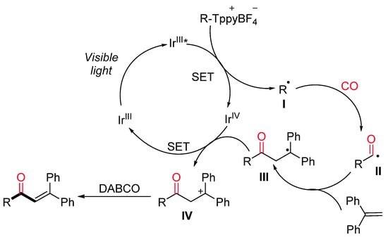 More recently, the same research group developed a visible-light-driven photocatalyzed synthesis of α,β-unsaturated ketones starting from alkyl Katritzky salts as a source of radicals []. In the context of a more general reactivity, a limited number of alkyl Katritzky salts reacted with 1,1-diphenylethylene in the presence of [Ir(4-Fppy)2(bpy)]PF6 and DABCO in MeCN under CO atmosphere and blue LEDs irradiation, leading to α,β-unsaturated ketones (Scheme 28). In the proposed reaction mechanism, the excited photocatalyst Ir(III)* is supposed to reduced alkyl Katritzky salts through a SET process (Scheme 29). The generated radicals I inserts one molecule of CO with the formation of an acyl radical II, which reacts with 1,1-diphenylethylene yielding the radical species III. Intermediate III is then reduced by the photocatalyst Ir(IV) with the formation of the cationic intermediate IV, which, lastly, undergoes a DABCO-mediated deprotonation step to deliver the final ketone.