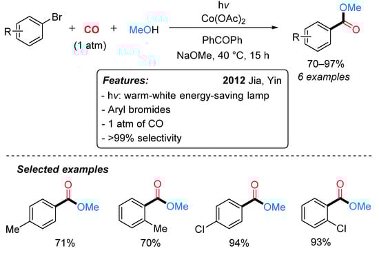 Cobalt salts have been found to efficiently catalyze the carbonylation of alkenes, chloro and bromoalkanes under UV irradiation [,,,,]. The first report on visible-light-mediated cobalt-catalyzed carbonylation reaction appeared in 2012, when Jia, Yin and colleagues, based on their previous findings [], developed a Co(OAc)2-catalyzed alkoxycarbonylation of aryl bromides under visible-light irradiation and mild conditions (Scheme 30) []. The use of a strong base (NaOMe) and an organic sensitizer (PhCOPh) was essential to the reaction’s success. Aryl bromides with a chloro substituent behaved better than tolyl bromides; however, a selectivity higher than 99% was always observed.