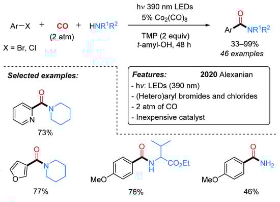 Recently, Alexanian et al. reported the visible-light-promoted aminocarbonylation of (hetero) aryl/vinyl bromides and chlorides using an inexpensive cobalt catalyst (Co2(CO)8) in conjunction with tetramethylpiperidine (TMP) (Scheme 31) [].