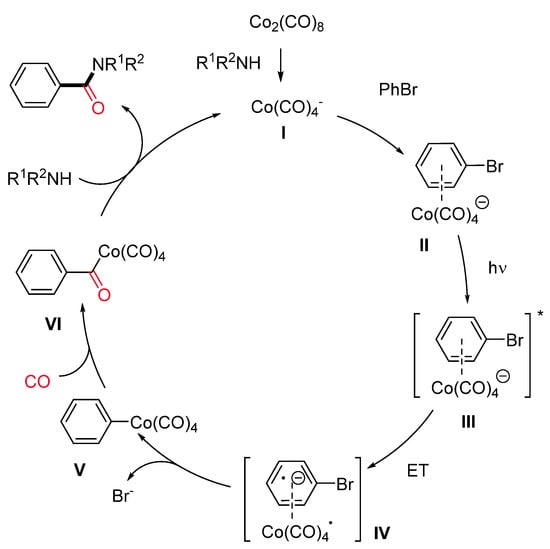 Aryl bromides having both electron-rich and electron-deficient groups, as well as vinyl bromides, were well tolerated. In addition, bromo heteroaryls, such as pyridines, furans, quinolines and indoles, also performed nicely in this reaction. Aryl chlorides with electron-deficient groups gave the expected amides in satisfactory to good yields. A wide variety of primary and secondary aliphatic amines, including amino acids, gave the corresponding amides in moderate to high yields. Preliminary mechanistic investigations were consistent with the first formation of a cobaltate anion [Co(CO)4]− (I) as an active catalyst and the subsequent generation of an electron donor–acceptor complex (EDA) II (Scheme 32). The intermediacy of the visible light leads to the corresponding excited species III. Then, a single-electron transfer produces two radical species (IV), which recombines, leading to a (hetero)aryl or vinyl cobalt species V. Finally, migratory insertion of CO affords intermediate VI, which undergoes displacement of the amine delivering the amide and the active catalyst.