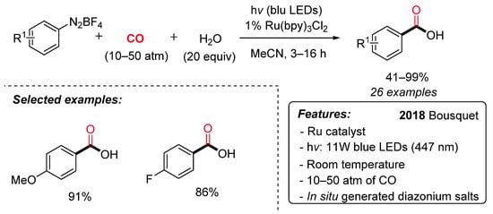 - Gosset, C.; Pellegrini, S.; Jooris, R.; Bousquet, T.; Pelinski, L. Visible-Light-Mediated Hydroxycarbonylation of Diazonium Salts. Adv. Synth. Catal. 2018, 360, 3401–3405. [Google Scholar] [CrossRef]