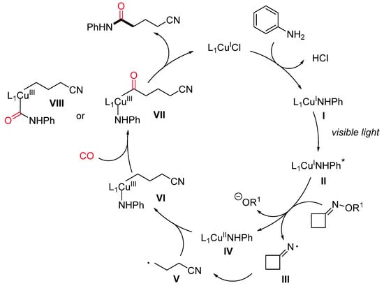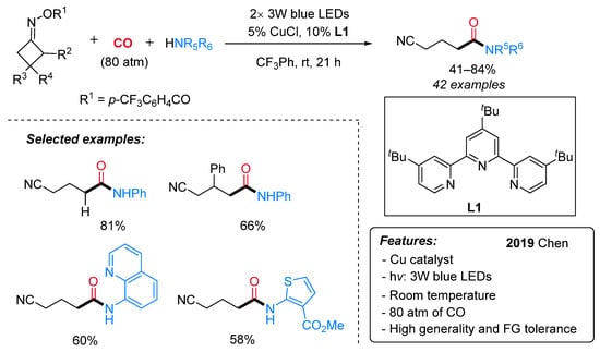 - Lu, B.; Cheng, Y.; Chen, L.-Y.; Chen, J.-R.; Xiao, W.-J. Photoinduced Copper-Catalyzed Radical Aminocarbonylation of Cycloketone Oxime Esters. ACS Catal. 2019, 9, 8159–8164. [Google Scholar] [CrossRef]