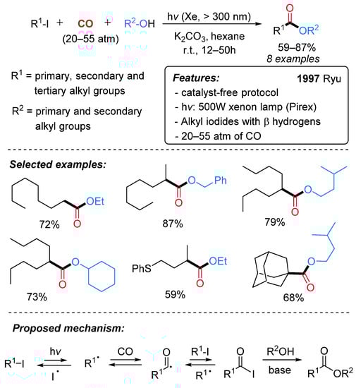 - Nagahara, K.; Ryu, I.; Komatsu, M.; Sonoda, N. Radical Carboxylation: Ester Synthesis from Alkyl Iodides, Carbon Monoxide, and Alcohols under Irradiation Conditions. J. Am. Chem. Soc. 1997, 119, 5465–5466. [Google Scholar] [CrossRef]