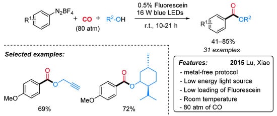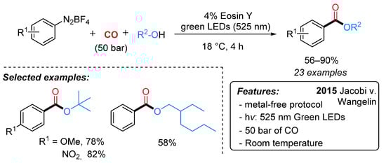 - Guo, W.; Lu, L.-Q.; Wang, Y.; Wang, Y.-N.; Chen, J.-R.; Xiao, W.-J. Metal-Free, Room-Temperature, Radical Alkoxycarbonylation of Aryldiazonium Salts through Visible-Light Photoredox Catalysis. Angew. Chem. Int. Ed. 2015, 54, 2265–2269. [Google Scholar] [CrossRef]