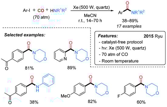 - Kawamoto, T.; Sato, A.; Ryu, I. Photoinduced Aminocarbonylation of Aryl Iodides. Chem. Eur. J. 2015, 21, 14764–14767. [Google Scholar] [CrossRef] [PubMed]