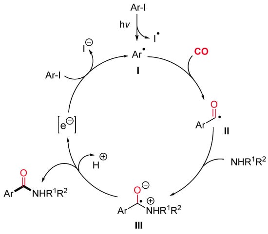 - Forni, J.A.; Micic, N.; Connell, T.U.; Weragoda, G.; Polyzos, A. Tandem Photoredox Catalysis: Enabling Carbonylative Amidation of Aryl and Alkylhalides. Angew. Chem. Int. Ed. 2020, 59, 18646–18654. [Google Scholar] [CrossRef]