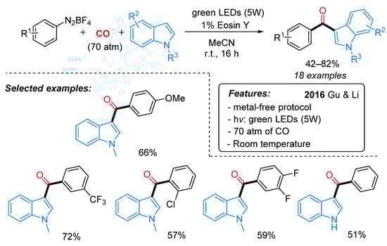 - Zhang, H.-T.; Gu, L.-J.; Huang, X.-Z.; Wang, R.; Jin, C.; Li, G.-P. Synthesis of Indol-3-Yl Aryl Ketones through Visible-Light-Mediated Carbonylation. Chin. Chem. Lett. 2016, 27, 256–260. [Google Scholar] [CrossRef]
