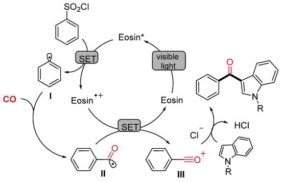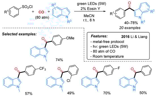 - Li, X.; Liang, D.; Huang, W.; Zhou, H.; Li, Z.; Wang, B.; Ma, Y.; Wang, H. Visible Light-Induced Carbonylation of Indoles with Arylsulfonyl Chlorides and CO. Tetrahedron 2016, 72, 8442–8448. [Google Scholar] [CrossRef]