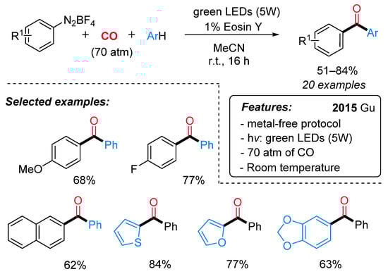 - Gu, L.; Jin, C.; Liu, J. Metal-Free, Visible-Light-Mediated Transformation of Aryl Diazonium Salts and (Hetero)Arenes: An Efficient Route to Aryl Ketones. Green Chem. 2015, 17, 3733–3736. [Google Scholar] [CrossRef]
