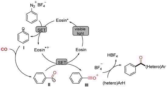 - Majek, M.; Jacobi von Wangelin, A. Metal-Free Carbonylations by Photoredox Catalysis. Angew. Chem. Int. Ed. 2015, 54, 2270–2274. [Google Scholar] [CrossRef]