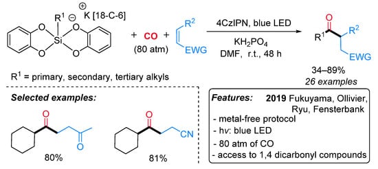 Recently, the first example of photocatalyzed oxidative carbonylation of organosilicates to unsymmetrical ketones has been reported by Fukuyama, Ollivier, Ryu, Fensterbank and co-workers []. This metal-free procedure is based on the use of an inexpensive organic dye, 4CzIPN, which, in combination with the blue led, is able to catalyze the reaction of alkyl bis(catecholato)silicates, CO (80 atm) and activated olefins to produce a wide range of ketones (Scheme 49). Notably, primary, secondary and tertiary alkyl radicals generated by the photocatalyzed oxidation of organosilicates underwent efficient carbonylation with CO under standard conditions. Interestingly, 1,4-dicarbonyl compounds were efficiently accessed through this protocol, while allyl sulfones were successfully employed as radical acceptors in this three-component reaction.