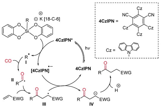 Mechanistic studies reveal that, initially, the photocatalyst is excited under visible-light irradiation. Then, the alkyl bis(catecholato)silicate undergoes oxidation by the excited 4CzIPN* through a single-electron-transfer (SET) process, leading to the formation of the alkyl radical species I and the reduced organocatalyst [4CzIPN]−. The alkyl radical I reacts with CO to generate the acyl radical II, which, in turn, adds to the activated alkene affording the radical intermediate III. Catalyst [4CzIPN]− converts III into the carbanionic species IV by reduction (SET), and, in this way, the photocatalyst is able to restart a new catalytic cycle. Finally, the base (KH2PO4) provides the proton for the formation of the final product (Scheme 50).