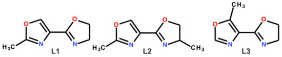 The structure of ligands: (L1) 4-(4,5-dihydro-1,3-oxazol-2-yl)-2-methyl-1,3-oxazole, (L2) 4-(4-methyl-4,5-dihydro-1,3-oxazol-2-yl)-2-methyl-1,3-oxazole, (L3) 4-(4,5-dihydro-1,3-oxazol-2-yl)-5-methyl-1,3-oxazole.