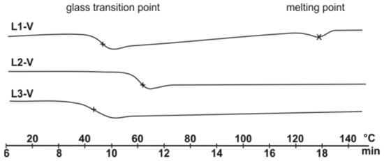The obtained copolymers have lower molecular weight than polyethylene (Mw, 180–410 × 103 g/mol). The molecular weight distribution is typical for vanadium catalysts (Mw/Mn, 2.2–2.8). The copolymers Mw decreases with increase in incorporation of norbornene units in copolymer chain (Table 1). DSC analysis (Figures S22–S24, S26–S28, S30–S32) shows that copolymers are amorphous materials with a glass transition temperature (Tg) that increases with increasing NB content. Differences amongst the copolymers produced using the studied catalysts are observed (Figure 2). Interestingly, the DSC curves of the copolymers prepared by the complex L1-V show both the glass transition temperature (Tg) and the melting point (Tm). Low melting peaks observed indicates relatively long ethylene sequences. The melting points (128 °C) of these copolymers are lower than those of polyethylene. This can be attributed to the long PE sequences in the copolymer containing small amounts of isolated NB units [29]. In contrast, the copolymers obtained using the catalysts L2-V and L3-V do not reveal melting points (Tm). This is evidence of the considerable homogeneity of copolymer, its amorphous nature.