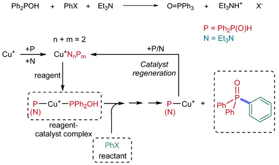 One can see that almost all Cu-catalyzed P–C couplings were performed in the presence of N-ligands and the activity of Cu was lower as compared to the Pd- or Ni-catalysts. Due to the several possible oxidation states of Cu, the mechanism of the transformations described above is presumably complex and for this, it has not yet been studied in detail.