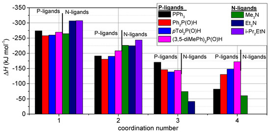 Extending the study to “heterogeneous” complexation, where NEt3 and Ph2P(O)H are present at the same time and compete with each other; overall, 14 species may be deduced. The map of the possible complexations is presented in Figure 3 together with the stepwise enthalpies computed. Figure 4 summarizes the situation showing that in case of higher ligations, the complexation with P-ligands is more beneficial than that with N-ligands.