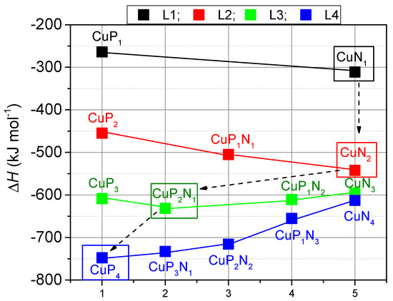 As it may be observed in the mechanism (shown in Figure 8), the thermodynamic stability of the central copper ion with different oxidation states (I and III) is significantly influenced by the surrounding ligands. The relative enthalpy for the oxidation process of Cu(I) to Cu(III) strongly decreases with the increase of the number of the P-ligands (0→1→2) in the complex (see Figure 9). Considering the oxidation process Cu(I)→Cu(III), the stepwise exchange of the N-ligands (NEt3) by a P-ligand goes with decreasing enthalpy differences of 1571.6 kJ mol−1 → 1410.2 kJ mol−1 → 1361.2 kJ mol−1. This unambiguously shows that a P-ligand may bring a higher stability for the Cu(III) oxidation state than the N-ligand. This trend is in contrast with the situation for Cu(I). It means, that the lone electron pair of the P atom may provide a larger electron density for Cu(III) than the N atom. Moreover, this energetic stabilization is not linear, as the first N→P ligand exchange results in a more significant gain (56.6 kJ mol−1) as compared to that assumed for the linear correlation (see red dot and the arrow in Figure 9). In other words, the N→P ligand exchange is exothermic for Cu(I), but endothermic for Cu(III).