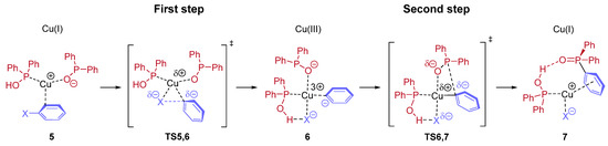 Regarding the reaction of Ph2P(O)H with PhX (X = Br or I), in the first approach, the mechanism was modelled assuming the excess of Ph2POH as the ligand to Cu+ ion. The bis-coordinated Cu(I) complex was expected to be the most reactive species. In the first step, the most stable “Cu(I)P4“ gets decomposed to precatalyst P---Cu(I)---P (4) that is then involved in a series of reaction sequences. The first step is the deprotonation by NEt3 followed by rearrangement to complex [HOPh2P---Cu+---–OPPh2] 4′ that is followed by the interaction of species 4′ with PhX to afford complex 5. Then, the C–X bond of species 5 is cleaved to afford intermediate 6 via TS5,6. In this state (6), the oxidation number of Cu is formally increased to 3+; therefore, this copper cation may be considered as a strong oxidizing agent. The endothermic oxidation of the Cu+ ion to Cu3+ is covered by the beneficial formation and coordination of the halide anion (X−). The next step involves the formation of the C–P bond via four membered TS6,7, which leads to the loose complex of the final product Ph3P (7). In this step, the Cu3+ is reduced back to Cu+, meanwhile the P(III) is oxidized to P(V). Finally, the Ph3PO product (1) leaves the Cu+ complex that takes up another P-ligand and a newer aromatic reagent for the next cycle (Figure 5).