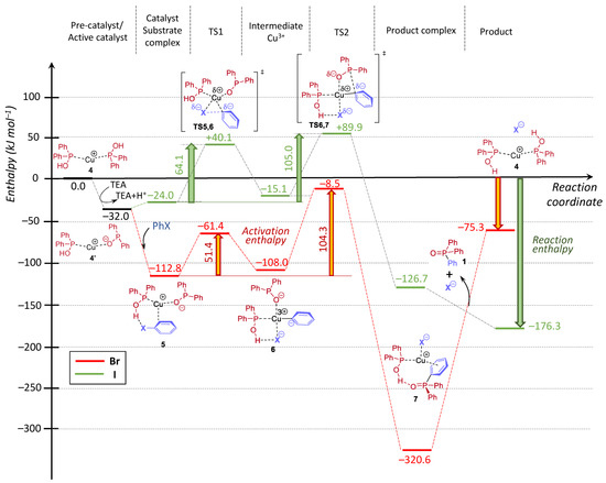 Computed reaction enthalpy (ΔH), Gibbs free energy (ΔG) in kJ mol−1 and entropy values (ΔS) in J mol−1K−1 of the Hirao reaction of Ph2P(O)H and PhX (X = Br [red line] and I [green line]) in the presence of Cu(I)(Ph2POH)2 (4) in respect to Figure 6.