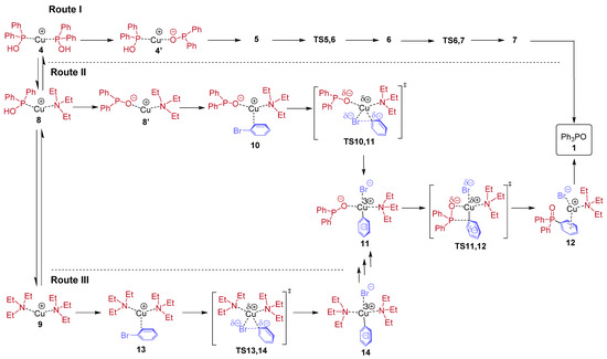 As it was mentioned above, the mixed P---Cu(I)---N complex (8) may also undergo a P-ligand exchange by a second molecule TEA to furnish N---Cu(I)---N complex (9) (Figure 7/Route III). However, the analogous oxidative addition step comprising the 13→14 transformation via TS13,14 involves a rather high enthalpy barrier (112.6 kJ mol−1) as compared to the previous versions (Figure 8/Route I and II). Hence, this route is not favorable kinetically. At this point, Route III joins Route II after the necessary N→P-ligand exchange, deprotonation and O-ligation, as shown in Figure 8/ Route III.