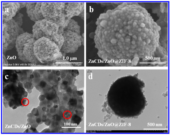 (a) SEM of ZnO (b) SEM of ZnCDs/ZnO@ZIF-8 (c) TEM of ZnCDs/ZnO (d) TEM of ZnCDs/ZnO@ZIF-8 composites.