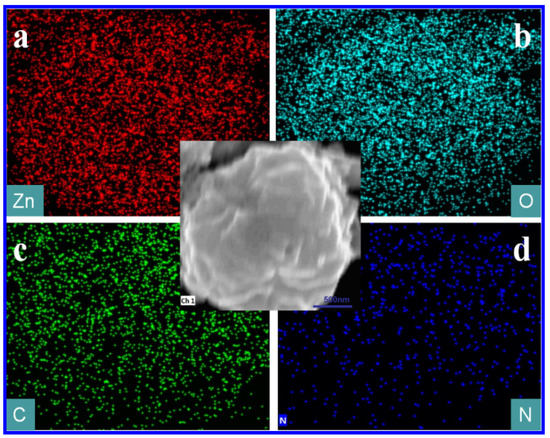 TEM analysis of ZnCDs/ZnO@ZIF-8 composites suggests a core–shell nanosphere, where the inner core is ZnCDs/ZnO heterojunction (Figure 1c) and the outer shell is ZIF-8 crystal (Figure 1d). Figure 2a–d are the elemental mapping diagrams of Zn, O, C, and N in ZnCDs/ZnO@ZIF-8 composites, respectively. It can be seen from the figures that these elements were evenly distributed on the materials.