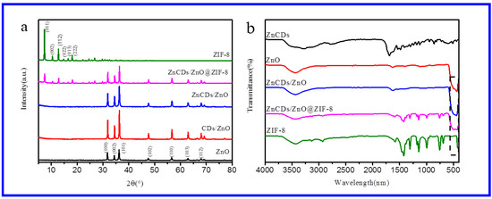 (a) XRD and (b) IR of ZnCDs/ZnO@ZIF-8 composites and related materials.