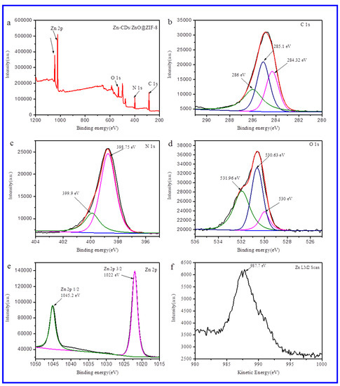 XPS analysis was carried out to understand the surface composition and electronic states of the constituent elements present in the composites. In common, the high-resolution survey scan of ZnCDs/ZnO@ZIF-8 revealed four peaks of Zn(2p), C (1 s), N (1 s), and O (1 s) at the ranges of 1045.2, 285.1, 398.7, 530.6 eV, respectively (Figure 4a). The C (1 s) spectrum further splits into three peaks at binding energies of 284.32, 285.1, and 286.0 eV, which are attributed to C=C/C–C, C–N/O, C=N, respectively [34] (Figure 4b). The presence of Zn−O and hydroxyl group is determined from the XPS spectrum of O 1 s. The peaks are centered at 530.0, 530.63, and 531.96 eV, respectively (Figure 4c). All of the peak positions are aligned with the literature [35]. The high-resolution spectrum of N (1 s) revealed a dominant peak at 398.75 eV, which deconvoluted into two peaks at 398.75 eV and 399.9 eV, and corresponded to N−C or N-H, respectively [36] (Figure 4d). The peaks of Zn 2p at 1022.0 eV and 1045.2 eV assigned to Zn 2p3/2 and Zn 2p1/2, respectively (Figure 4e), proved the presence of Zn2+ in the sample [29]. The high-resolution XPS spectra of bare ZnO indicates the peaks at 1021.8 and 1044.9 eV, which were reported earlier [37]. Zn LM2 Scan Auger peak of ZnCDs/ZnO@ZIF-8, as shown in Figure 4f, also indicated that the formation of the composites [38].