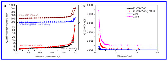 Figure 5a shows the nitrogen adsorption−desorption isotherms of ZnCDs/ZnO@ZIF-8 and related materials ZnO, ZnCDs/ZnO, and ZIF-8. The curves of ZIF-8 are a typical type I nitrogen adsorption−desorption isotherm [39], which fit well with the microporous frameworks of ZIF-8. The curves for ZnCDs/ZnO are a type IV isotherm [39], which shows low adsorption at low pressure and multilayer adsorption at high pressures owing to slits caused by assembly of ZnO. The specific BET surface area is 9.94 m2/g. For comparison, the BET surface area of ZnCDs/ZnO@ZIF-8 is 583.3 m2/g, higher than that of ZnCDs/ZnO. The initial adsorption of ZnCDs/ZnO@ZIF-8 is higher than that of ZnO, indicating that micropores exist in ZnCDs/ZnO@ZIF-8, which can be attributed to the frameworks of ZIF-8. The multilayer adsorption at high pressure corresponds to spherical morphology of the sample, similar to that of ZnO [21]. Figure 5b summarized pore size distribution by BJH method [40]. It indicates that the pore size of ZnCDs/ZnO@ZIF-8 distribution is wide.