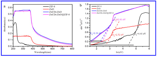The optical absorption properties of ZnCDs/ZnO@ZIF-8 and various related materials are shown in Figure 6a. All the absorptions occurred in the wavelength range of 200~400 nm. The observation indicates that the absorption intensity of ZnCDs/ZnO@ZIF-8 is higher than that of ZnO nanospheres and ZIF-8, respectively. The absorption ability in the visible-light region is enhanced as ZnCDs/ZnO enveloped by ZIF-8, which is conducive to the utilization of the solar spectrum. The band gap energies (E) of direct transition semiconductor can be calculated according to the plot of (ahv)2 versus photon energy (hv) [41]. As shown in Figure 6b, the Eg of ZnCDs/ZnO@ZIF-8 estimated to be 2.41 eV, which is narrower than that of ZnO (2.72 eV) and ZIF-8 (4.41 eV), respectively, owing to the incorporation of ZnCDs/ZnO with ZIF-8.