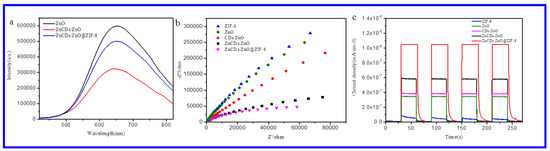 The fluorescence spectra of the as-synthesized composites and the related samples exhibit emission peaks centered at around 650 nm (Figure 7a). The absorbance intensity of ZnCDs/ZnO@ZIF-8 increased with respect to that of ZnCDs/ZnO and ZIF-8. As everyone knows, the radius of each arc is relevant to charge-transfer resistance: the smaller the radius of the arc, the lower the corresponding impedance [42]. As displayed in Figure 7b, ZnCDs/ZnO@ZIF-8 shows the smallest charge-transfer resistance compared with that of ZnCDs/ZnO, ZnO, and ZIF-8, coinciding with the conclusion of the EIS results. The transient photocurrent responses and electrochemical impedance spectra of the composites were employed to further explore the separation efficiency of the photogenerated charge carriers [43]. As shown in Figure 7c, the photocurrent responses of ZIF-8 are quite low, which may stem from the fast recombination of electron-hole pairs. Compared with ZnCDs/ZnO, ZnO, and ZIF-8, ZnCDs/ZnO@ZIF-8 composites exhibits the highest photocurrent density. It can generate considerably enhanced photo-currents with four visible-light irradiation on–off cycles. This indicates ZnCDs/ZnO-loading accelerates the transfer of the photo-generated electrons and holes at the interface between ZnCDs/ZnO and ZIF-8.